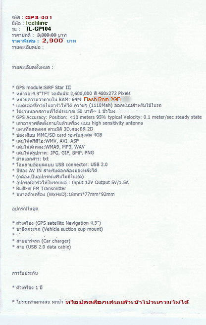 เครื่องนำทางด้วยดาวเทียมหรือ GPS Navigator ขนาดหน้าจอ5.0 นิ้วระบบสัมผัส ของบริษัท Techline ผู้ชำนาญการผลิต วิทยุ-ทีวีติดรถยนตร์อันดับหนึ่งของประเทศจีน พร้อมโปรแกรมแผนที่ใหม่ล่าสุด IGO PRIMO มี AV IN ต่อกล้องมองหลังได้ทันที พร้อมBlutoothต่อเชื่อมกับระบบโทรศัทพ์มือถือ และระบบ FM Transmitter เพื่อต่อเชื่อมกับวิทยุในรถของท่าน นอกจากนั้นยังมีโปรแกรมอื่นอีกมากมายในเครื่อง(ดูวีดีโอทดสอบเครื่องรุ่นนี้คลิกที่ลิ้งค์ได้เลยครับ): http://www.youtube.com/watch?v=_rlIfsIausg&feature=related