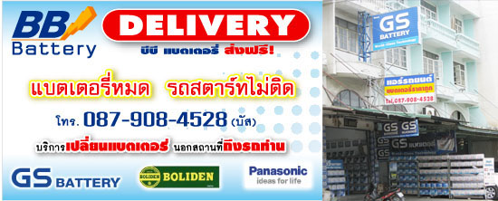 ร้านบีบีแบตเตอรี่-เราจำหน่ายแบตเตอรี่รถยนต์ Battery GS,Battery BOLIDEN,Battery PANASONIC,Battery YUASA นอกจากนี้เรายังให้บริการ "เปลี่ยนแบตเตอรี่รถยนต์" นอกสถานที่ ร้านบีบีแบตเตอรี่ 087-908-4528,02-931-1735 บัส เปิดบริการทุกวัน