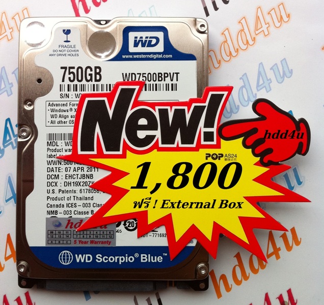 HDD 750GB 1,800บาท : WD7500BPVT Scorpio Blue 2.5" SATA-II 3 Gb/s 5400RPM, 16 MB,รับประกัน 5Year แถมฟรี External Box !!!!