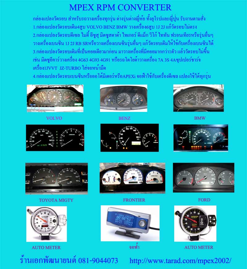 ช่วงนี้น้ำท่วมแต่สามารถส่่งของได้ครับ พิเศษ รุ่นใหม่มาแล้ว ที่นี่ที่เดียวครับ ปรับจูนความเร็วด้วยcomputer เปรียบเทียบความเร็วกับ GPS วิ่งไปปรับจูนให้เห็น เที่ยงตรงแบบสั่งได้ ส่วนวัดรอบเครื่องก็สามารถปรับจูนได้ด้วยครับ เที่ยงตรงแม่นยำ ที่นี่ที่เดียวเช่นกันครับ ดูแผนที่ร้าน http://www.pantipmarket.com/mall/mpex2002/ จำหน่ายสมาชิกมากว่า 7ปี ขอบคุณสมาชิกทุกท่านที่มาใช้บริการกับทางร้านครับ สนใจสอบถามได้ครับ ผลงาน http://www.blogka.com/albums/mpex/ อุปกรณ์เพิ่มสำหรับรถแต่ง ปลดบูส ปลดล๊อคความเร็ว jz-geและ jzเทอร์โบ และ ตัวปลดล๊อค vvti ปลดเนียนๆเลย ไม่มีปัญหาเหมือนรุ่นอื่นๆ วัดรอบ 1000 ไมล์ 1200 ครับ เปิดจันทร์-เสาร์ หยุดวันอาทิตย์โทรนัดได้ตลอด อย่างอื่นโทรถามได้ครับ 0819044073