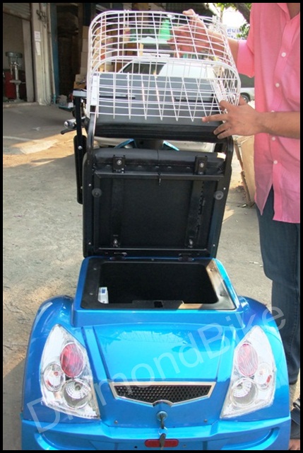เบาะปรับระยะใกล้-ไกลได้ ด้านล่างเป็นช่องที่เก็บของ ด้านหลังมีตะกร้าใส่ของ ด้านท้ายมีกุญแจล๊อคได้ มีเกียร์ปรับเดินหน้า-ถอยหลัง