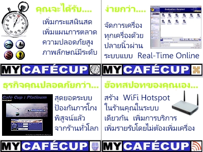 MyCafeCup ไม่ได้แค่เพียงมีจุดประสงค์หลักเพียงเพื่อเป็นเครื่องมือช่วยนับเวลาการใช้ งาน แต่ในความเป็นจริงนั้นถูกออกแบบมาจาก แนวคิดในการขยายผล ทางธุรกิจ โดยใช้ เทคโนโลยี่ เชิงก้าวหน้า เพื่อลดปัญหา, จุดบอด หรือช่องโหว่ ของธุรกิจ Internet Cafe ซึ่งส่งผลให้ ธุรกิจที่ตัดสินใจนำไปใช้นั้น ดำเนินไปอย่างมี ประสิทธิภาพ โดยไม่จำเป็นต้องพึ่ง Technology ที่ซับซ้อนเกินความจำเป็นและยากต่อการจัดการ ดังนั้นคุณอาจจะพบว่าด้วย MyCafeCup คุณจึงไม่ต้องเอาเวลาทั้ง หมดมาเฝ้า ธุรกิจด้วยตนเอง คุณจึงอยู่ในฐานะ ที่คุณเป็นเจ้าของแบบผู้บริหารงาน อย่างแท้จริง โดยไม่ต้องเอาเวลา อันมีค่าของคุณมาใช้ในฐานะเป็นผู้เฝ้าร้าน ซึ่งไม่จำเป็น ดังนั้นคุณจะสามารถ บริหารเวลา ส่วนตัว ได้อย่างเต็มที่ ตรงกับความสามารถ จริงๆ ที่คุณมีอยู่ Download วันนี้ สัมผัสวันนี้ ทันที ที่