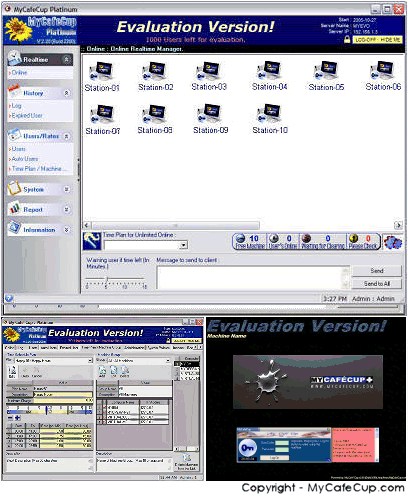 :: MyCafeCup, the completed internet cafe software solutions for the operation of an Internet Cafe, Gaming Cafe, Online Game Center, Internet Caffe, Business Center and other PC rental system. Designed primarily for Cyber Internet Cafe business and also can be used to control the PCs on your intranet. System functions and user interface has been designed to be easy to use with little or no experience in the computer industry. The software allows you to set up various marketing plans for each user to choose from. MyCafeCup is Client / Server application which allows you to easily manage and monitor all client machines status remotely from the Server in on-line and in real time. Administrators can just monitor or manage the things at clients easier from the server, such as shutdown, reboot, force the user to log-out, see the running applications, etc ....