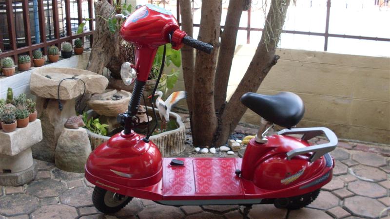 ขายสกูตเตอร์ไฟฟ้า สีแดงน่ารัก มีไฟหน้า แตร ท้ายใส่ของ คอพ้บได้ยกขึ้นรถสบาย น้ำหนักเบา ใช้แบตเตอร์รี่ 2 ก้อนขนาด 6v 10ap