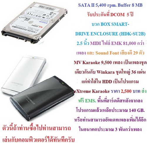 2. SAMSUNG N/B 320 GB. 2.5 นิ้ว SATA II 5,400 rpm. Buffer 8 MB รับประกันที่ DCOM 5 ปี บวก BOX SMART-DRIVE ENCLOSURE (HDK-SU2B) 2.5 นิ้ว MIDI ไฟล์ EMK 81,000 กว่าเพลง และ Sound Font เสียงดี 31 ตัว MV Karaoke 9,600 เพลง เป็นเพลงชุดเดียวกันกับ Winkara ชุดใหญ่ 36 แผ่น แต่ทำใส่ใน HDD เป็นโปรแกรม eXtreme Karaoke ตัวนี้ถ้าท่านซื้อไปท่านสามารถเล่นกับคอมพิวเตอร์ได้ทันทีครับ ราคา 2,500 บาท ส่งฟรี EMS.