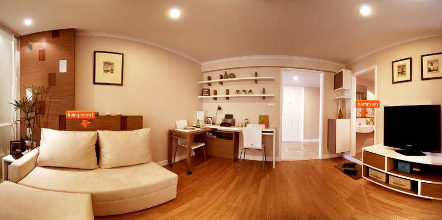 ดอนโด 1 ห้องนอน ห้องน้ำ ห้องนั่งเล่น ห้องครัว ระเบียง ในตึก A (ตึกที่อยู่ติดถนนมากที่สุด)