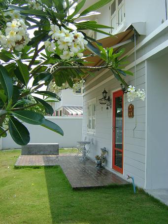 6. แต่งเฌอร่าสวย มีพื้นระแนงไม้หน้าบ้าน ด้านในชั้นล่างแต่งเฌอร่าสวยมาก
