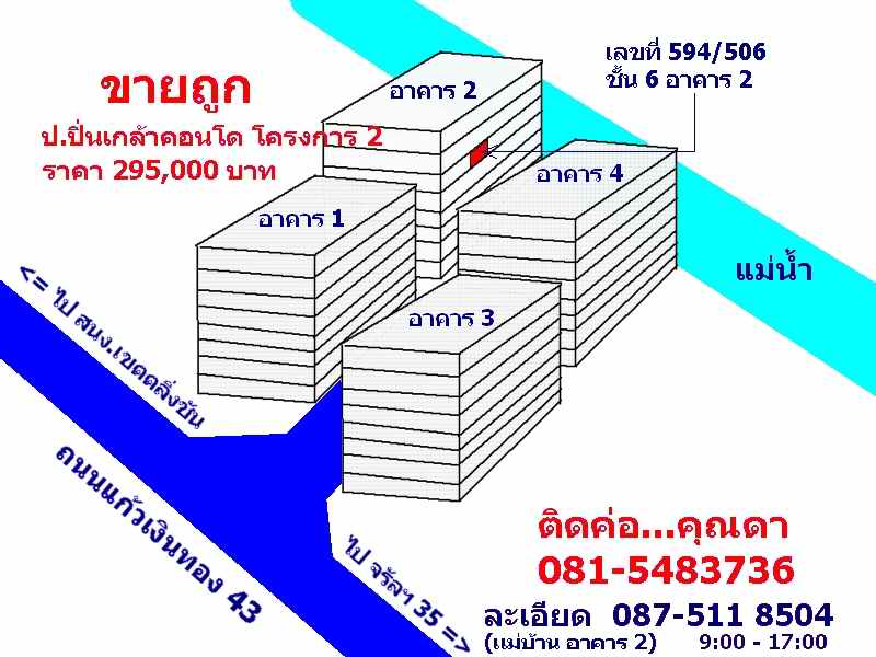 ขายคอนโด ป.ปิ่นเกล้าคอนโด โครงการ 2 อาคาร 4 ชั้น 4 เลขที่ 594/852 ถนนแก้วเงินทอง 43 เนื้อที่ 25 ต.ร.ม. มีระเบียงด้านหลัง พร้อมมุ้งลวด เหล็กดัด ไม่มีค่าส่วนกลางติดค้าง โอนได้เลย มีที่จอดรถ มีลิฟท์ รปภ. ผ่านเข้า-ออกด้วยระบบคีย์การ์ด มีกล้องวงจรปิด ใกล้ห้างแมคโคร จรัญ35 สนง.เขตตลิ่งชัน ตลาดน้ำ สน.ตลิ่งชัน เข้าออกได้หลายทาง ทั้งทางด้านส.น.ตลิ่งชัน (ถนนบรมราชชนี) หรือถนนบางขุนนนท์ และถนนจรัญ 35 หรือถนนตัดใหม่เลียบทางรถไฟ ใกล้โรงพยาบาลศิริราช สายใต้แห่งใหม่ ห้างเซ็นทรัลปิ่นเกล้า และตลาดน้ำตลิ่งชัน ติดถนนเมน มีรถประจำทางผ่าน ขายถูกกว่าราคาประเมินมาก เข้าแบ๊งค์ได้ 3.7 แสน ราคาซื้อ-ขายปกติ 4- 500,000 (เช่ากันเดือนละ 3-4,000) ขายเพียง 310,000 เท่านั้น ติดต่อด่วนที่