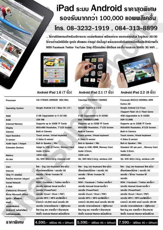 (( ตารางข้อมูลเปรียบเทียบ Android iPad แต่ละรุ่น จัดทำโดยทีมงาน Super Phone ไม่อนุญาติให้ผู้อื่นนำไปใช้เผยแพร่ ไม่ว่ากรณีใดๆ ))