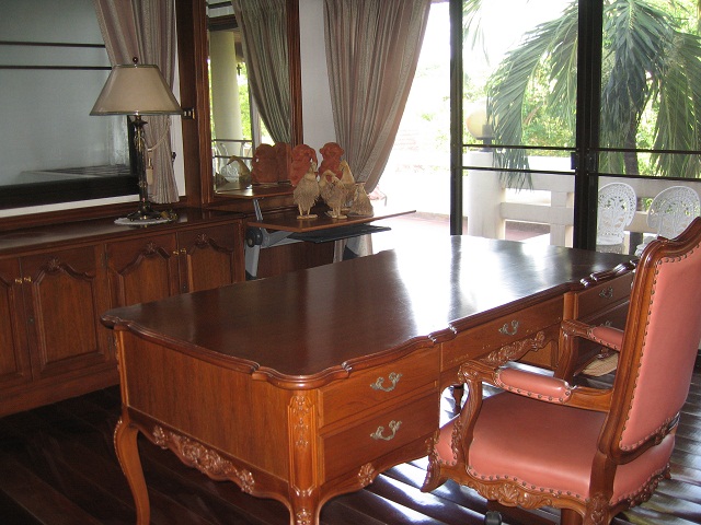 เฟอร์นิเจอร์ภายในไม้สักสไตล์หลุยล์ เนื้อที่ มีบ้านใหญ่สองชั้น 1 หลัง และบ้าน 1 ชั้นอีก 1 หลัง