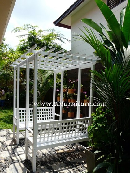 ซุ้มไม้ระแนง ซุ้มแฝด จากไม้เนื้อแข็ง ใช้เป็น ที่นั่งในสวนสวยของคุณ มีที่นั่งในบริเวณซุ้ม นั่งได้สูงสุด 6 ท่าน