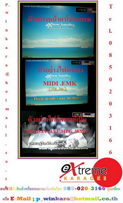 โปรแกรม eXtreme Karaoke เพลงจากต้นฉบับ VCD Karaoke .DAT ล้วนๆ 24,300 บวกเพลง MIDI ไฟล์ .EMK 81,000 กว่าเพลง และ Sound Font เสียงดี 31 ตัว เล่นเพลง MV Karaoke จากโปรแกรมคอมพิวเตอร์ ต่อผ่านช่อง HDMI ของ LCD TV. จอใหญ่ๆ ภาพคมชัดไม่มีแตกไม่มีเบลอ แหล่มสุดๆ ครับ ตัวนี้ใช้เนื้อที่ HDD 976 GB. รุ่นนี้เราจะมี HDD ให้เลือกซื้อกันอยู่ 2 ขนาดครับ
