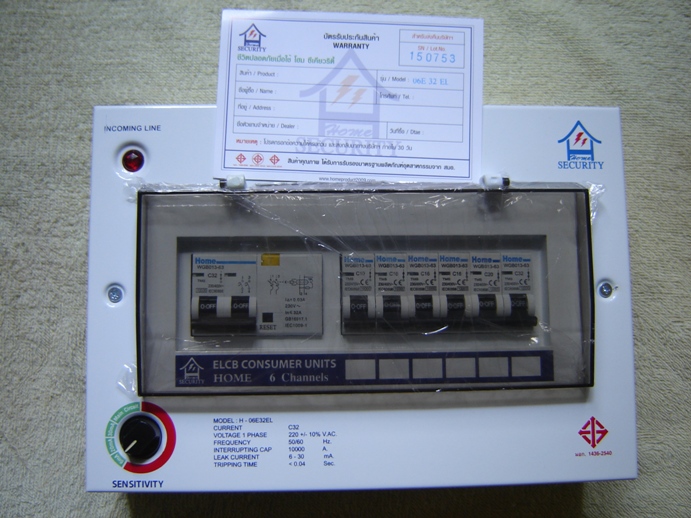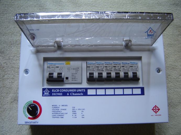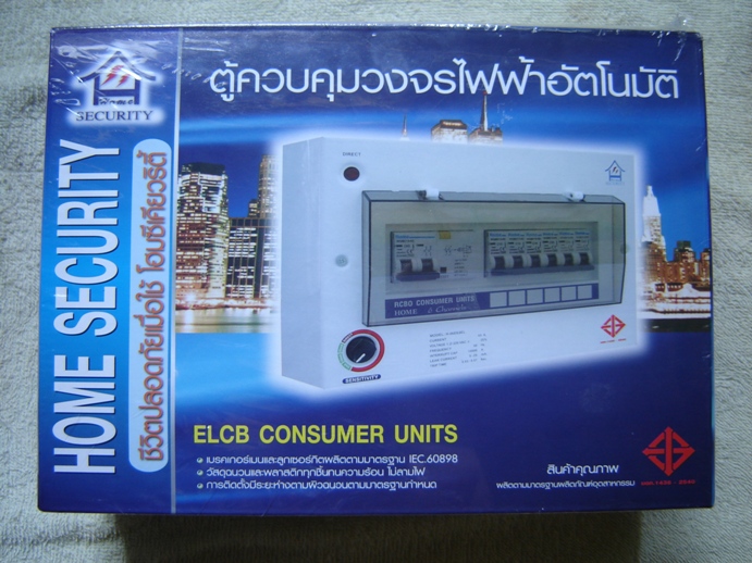 1.ตู้สำเร็จตัดวงจรไฟฟ้าอัตโนมัติ ELCB Consumer Units ขนาดเมนเบรกเกอร์ 32 และ 50 แอมป์ 6,8 และ 10 ช่อง ตามลำดับ ของ Home Security ป้องกันไฟฟ้ารั่ว , ไฟฟ้าัดูด , ไฟฟ้าซ๊อต และใช้กระแสไฟฟ้าเกิน เหมาะกับบ้านพักอาศัยหรืออาคารพาณิชย์ที่ใช้มิเตอร์ไฟฟ้า 10( 30A ) และ 15 ( 45 A ) หรือติดตั้งป้องกันไฟฟ้าดูดไฟฟ้าช๊อตที่ใช้กระแสไม่เกิน 32 และ 50 แอมป์ สามารถปรับความไวอัตรากระแสรั่วไหลได้ หลักการทำงานคล้ายกับสินค้าชื่อดังที่โฆษณากันอยู่