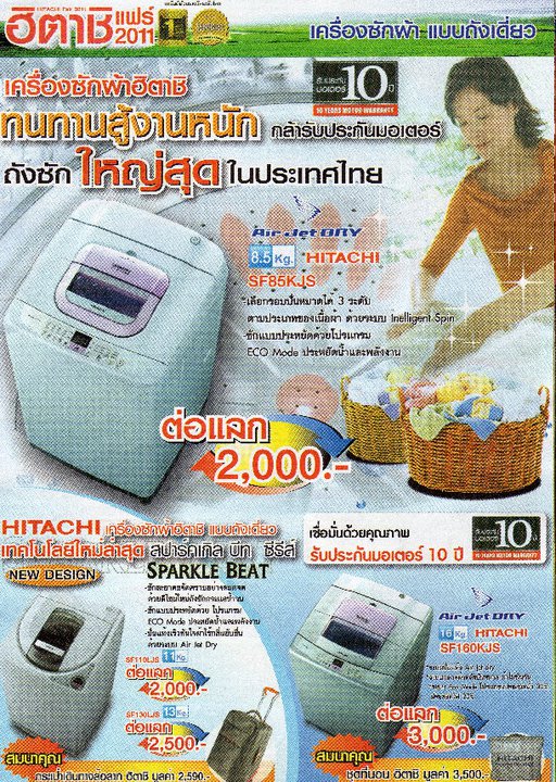1.เครื่องซักผ้า Hitachi แข็งแรงทนทานสู้งานหนัก รับประกันมอเตอร์ 10 ปี ขนาด 8.5 -11 กิโลกรัม มีเครื่องซักผ้าเก่านำมาต่ีอแลกเครื่องใหม่ได้ 2000 บาท ขนาด 13 กิโลกรัม ต่อแลกได้ 2500 บาท ผ้าแห้งใวไร้กลิ่นอับชื้นด้วยระบบ แอร์เจท ดรายฟิลเตอร์ นาโนไททาเนี่ยม