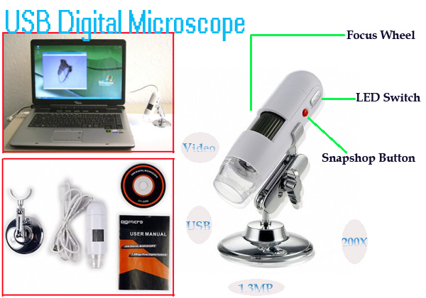 เป็นสินค้ามาใหม่ มีขนาดเล็กพกพาสะดวก เหมาะสำหรับ •ใช้ในการเรียนการสอนวิทยาศาสตร์ • สังเกต ผิว ส่วนตัว •การตรวจสอบ ฟอสซิล และงานอดิเรก • ตรวจสอบพระเครื่อง •เครื่องประดับ นาฬิกา และ ประเมินผล งานศิลปะ •อุตสาหกรรม การผลิต ยกตัวอย่างเช่นตรวจสอบ PCB องค์ประกอบ Electronic •การสังเกต ลักษณะ และ โครงสร้าง •ขยายเพื่อดูพื้นผิวสิ่งของขนาดเล็ก •ตรวจสอบ สิ่งทอ •วิทยาศาสตร์ วิจัย •ดู วิดีโอ ในคอมพิวเตอร์ของคุณ จาก กล้องจุลทรรศน์ ของคุณ •จับ ภาพสี สดใส ด้วย ความละเอียด 640 x 480 pixels •ภาพ วิดีโอ จะถูกส่ง ไปยังคอมพิวเตอร์ ผ่านทาง พอร์ต USB •คมชัด แสง อัตโนมัติ และ ปรับ โฟกัส •ง่ายต่อการ ติดตั้ง ชุด ซอฟต์แวร์เพื่อ ดูแก้ไข และ บันทึกภาพ อีก *****Specifications:***** •RoHS,FC & CE Certificate •Image Sensor: 1.3 Mega Pixels(Max 5.0Mega) •Controller: High Speed DSP •Lens: Dual Axis 27X & 200X Micro-Scope Lens •Focus Range: Manual Focus from 10mm-44mm •Snap Shot: Software and Hardware(Optional) •Video Capture Resolution: 1280x1024(1.3M Pixel), 640x480,320x240, 160x120. 2560x2048(5M Pixel),2304x1738(4M Pixel),1600x1200(2M Pixel) •Frame Rate: Max 30 f/s Under 600 Lux Brightness •Flicker Control: 50 Hz / 60 Hz Option •Shutter Speed:1 sec to 1/1000 sec •Video Format: AVI/format •Snap Shot Format: JEPG •Light Source: White Light LED x 4 with ON/OFF switch •Magnification Ratio: 10X - 200X (Manual) •Power Supply: USB Port (5V DC) •Software Compatibility: TWAIN / VFW/ Direct Show AP (Driver) •Interface: USB1.1 & USB2.0 Compatible •Operation System: Support windows 7,windows XP,vista 32b •OSD Language: English •Dimension: 110 mm ( L ) X 33 mm ( R ) •Color: white