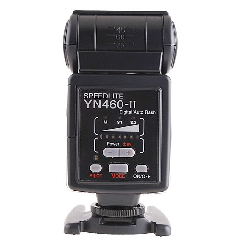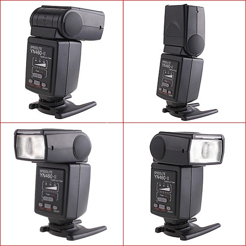 * Increasethe Flash index from 33 to 38 (at 35mm focal length, ISO 100 in meters) and 53 (at 35mm focal length, ISO 200 in meters). * has the output power fine-tuning fucntion, If the 7 output power can't meet your demand, You can press "+" or "-" buttons to fine tune the output power of the flash with step length of 1/7 ev in order to obtain finer exposure control, so there are 48 step length for you to choose. * The recycling time is much faster than the first version. * With Reflector board and diffusing board to take photos * With test button and charging indicator. * Bounce Flash. * Use Wide-angle Diffuser. * Rear-curtain Sync. * Multiple Flash Application. * Built-in reflector/soft board. * Built-in diffuser board. * Lock ring. * Hot shoe mount. * Output level adjustment. * Charge indicator. * Swivel head. * Top brand product, high quality guaranteed. * Works with a wide range of cameras including Nikon, Pentax, Canon and Olympus. Speicifications: * Brand: Yongnuo * Model: YN460-II * Guide number: 38 (at 35mm focal length,ISO 100 in meters) 53 (at 35mm focal length,ISO 200 in meters) * Flash Mode: M, S1, S2 * Flash power control: Level 46 light quantity output control with 1/7-stop uncrement * Circuit design: Insulated Gate Bipolar Transistor (IGBT) * Up/down ward angle: 0-90 degree * Left/right angle: 0-270 degree * Power Source: 4 * AA size batteries (Alkaline or Ni-MH are usable) * Battery Life: 100 - 1500 times (with alkaline batteries) * Recycle Time: Approx. 4Sec., with fresh AA size alkaline batteries * Slave Mode S1: Normal Optic Slave * Slave Mode S2: Pre-flash Cancel Slave * Color Temperature: 5600K * Flash Duration: 1/800S - 1/20000S * Flash adjustment: 7 different power level (1/2, 1/4, 1/8, 1/16, 1/32, 1/64, 1/7) * Power Saving: Stand by mode, 30mins to power off mode; 60mins to power off when using the optic mode * Color: Black * Product size: 170*60*52mm * Product weight: 265g * Package weight: 190*94*80mm * Package weight: 400g