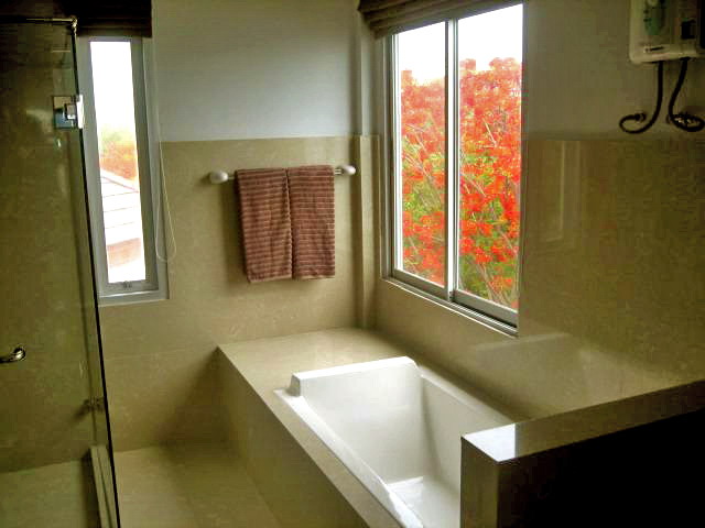 4 ชั้น 5 ห้องนอน แอร์ทุกห้อง 6 ห้องน้ำ มีเครื่องทำน้ำอุ่นทุกห้อง, มีอ่างอาบน้ำ, ทุกชั้นมีระเบียงชมวิวทะเล