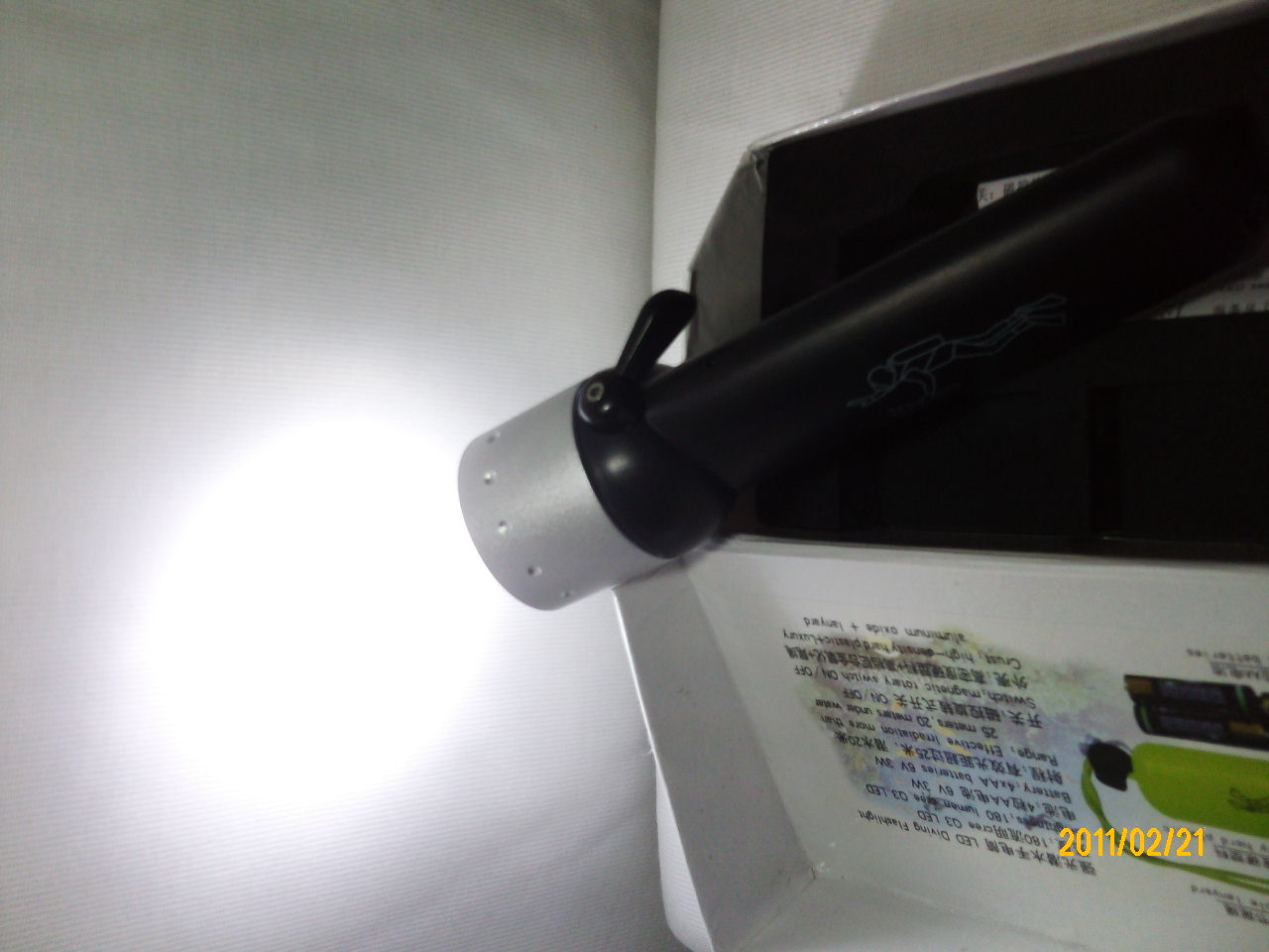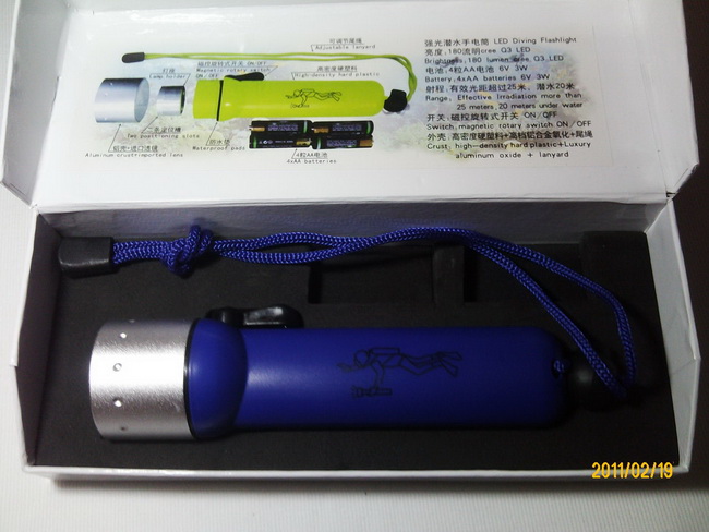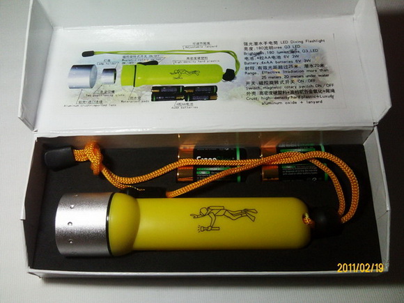 ทำจากพลาสติคที่มีความแข็ง ส่วนหัวเป็นอลูมิเนียมออกไซด์ ความสว่างของแสง 180 ครีลูเมน สามารถส่องใต้น้ำได้ มากกว่า 20 เมตร ใช้ถ่าน AA 4ก้อน ราคา 590 บาท