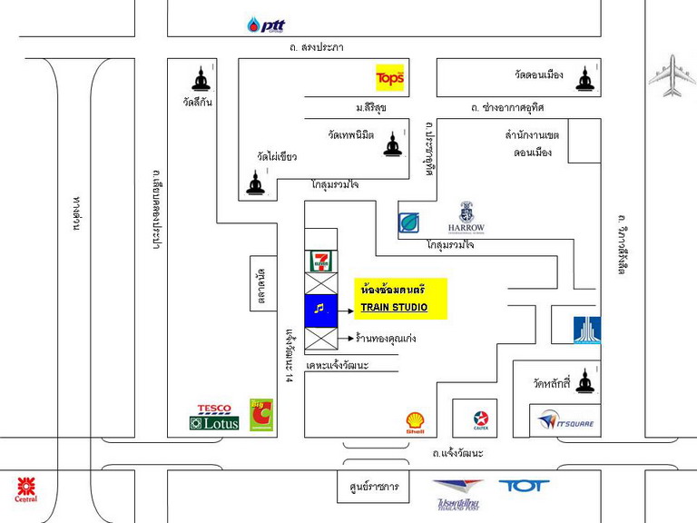 ห้องซ้อมดนตรี TRAIN STUDIO อยู่หน้าเคหะแจ้งวัฒนะ หาง่าย ใกล้เซเว่น ตรงข้ามตลาดนัด ติดร้านทองคุณเก่ง เข้าออกได้หลายทาง ดูแผนที่ประกอบนะจ๊ะ ดูรูปห้องด้านล่าง
