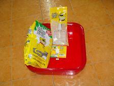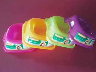 กระบะทรายสี่เหลี่ยมผืนผ้า (ในรูปสีฟ้า)พร้อมที่ตัก และทรายแมว ชามกลม 2 ใบ