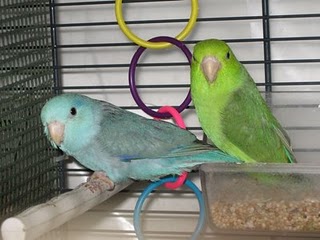 ภาพที่ 2. ลูกป้อนที่ประกาศขายคือนกตัวสีเขียวครับที่เกาะด้านหลัง โตมาเป็นแบบนี้ครับ