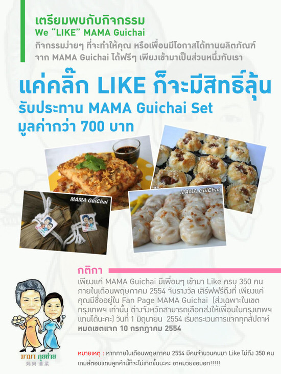 กิจกรรมง่ายๆ ที่จะทำให้คุณ หรือ เพื่อนมีโอกาสได้ทานผลิตภัณฑ์จาก MAMA GuiChai ได้ฟรีๆ เพียงแค่คลิ๊ก Like ใน FB (facebook.com/mamaguichai)