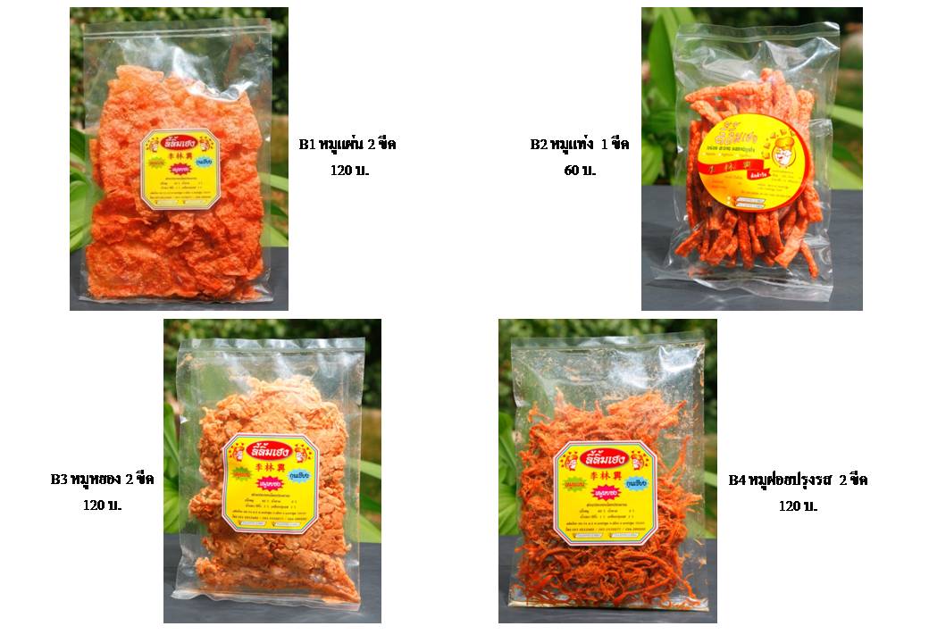 - หมูหยอง, หมูแผ่น, หมูฝอยปรุงรส บรรจุถุง 5 ขีด ราคาถุงละ 300บาท