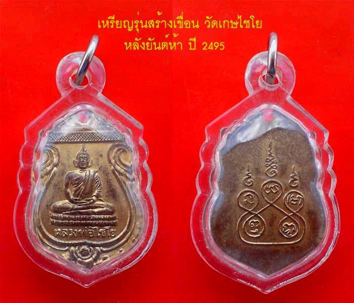 เป็นเหรียญที่สร้างในคราวสร้างเขื่อนปีพ.ศ.๒๔๙๕ ด้านหน้าเป็นหลวงพ่อวัดไชโย ด้านหลังเป็นยันต์ห้า พิธีใหญ่มาก เกจิเก่งๆทั้งนั้นครับ เช่นหลวงพ่อจง วัดหน้าต่างนอก หลวงพ่อรุ่ง ท่ากระบือ หลวงพ่อเงิน หลวงพ่อเต๋ ฯลฯลฯ