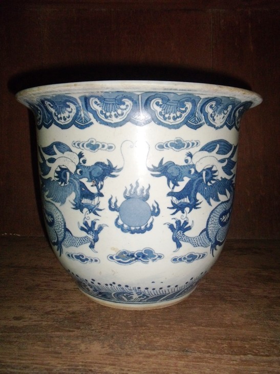 - กระถางต้นไม้ลายคราม(ญี่ปุ่น) ลายมังกรด้นเมฆ ขนาดปากกว้าง 11 นิ้ว สูง 9 นิ้ว ขอบปากบิ่น 1 จุด นอกนั้นสมบูรณ์ ราคาไม่แพงครับ