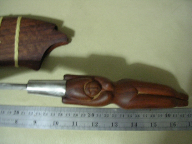 ด้ามและฝักทำจากไม้ประดู่แท้ ด้ามแกะสลักเป็นรูปหญิงสาว