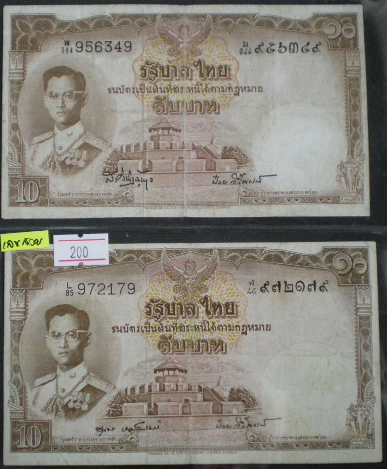 ธนบัตร ชนิดราคา ๑๐ บาท สมัยรัชกาลที่ ๙ แบบ ๙ เลขมงคล เก้าหน้า-เก้าหลัง หมายเลข ๙๕๖๓๔๙ และ ๙๗๒๑๗๙ สภาพสวย หายาก ราคา คู่ละ 900 บาท (w.970)