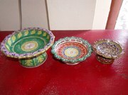 - จานเชิง 3 ใบ 3 แบบ ขนาด 4 นิ้ว เป็นเบญจรงค์เนื้อกังไส ส่วนขนาด 3 นิ้วกับ 5 นิ้วเป็นเนื้อดินอยุธยาหายากครับ