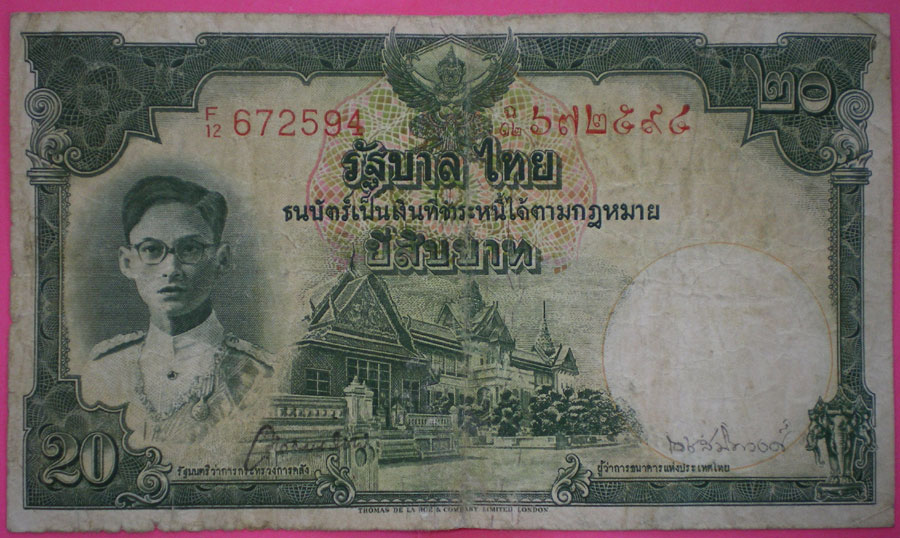 ธนบัตร ชนิดราคา ๒๐ บาท สมัยรัชกาลที่ ๙ หน้าหนุ่ม ลายเซ็น วรรธ-เดช หมวด F 12 เลขแดง หมายเลข ๖๗๒๕๙๔ สภาพผ่านการใช้งาน หายาก ราคา ฉบับละ 8,500 บาท (ว.934)