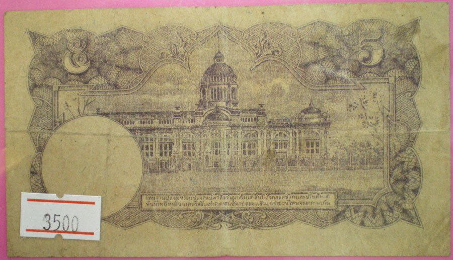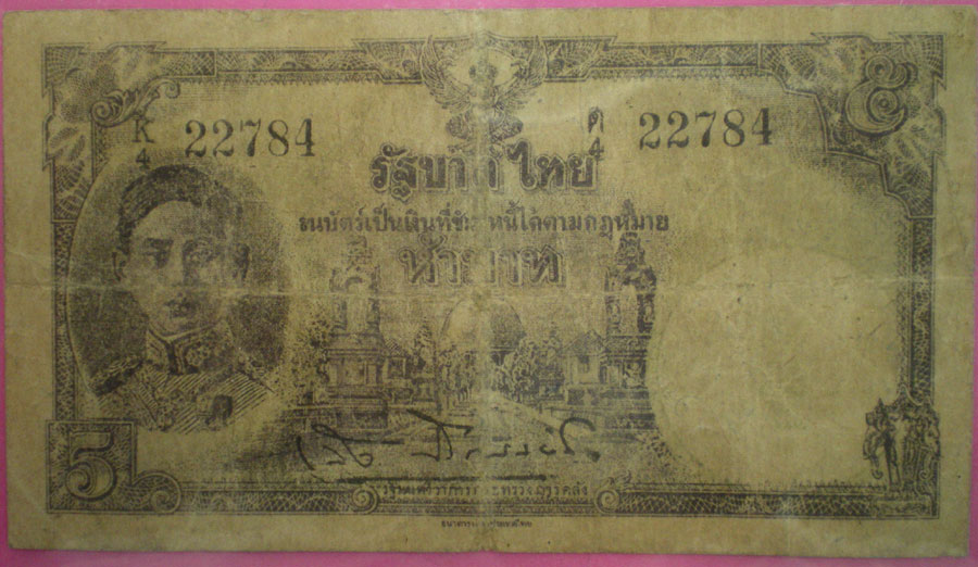 ธนบัตร ชนิดราคา ๕ บาท สมัยรัชกาลที่ ๘ กรมแผนที่ ลายเซ็น เล้ง ศรีสมวงศ์ หมายเลข 22784 สภาพสวย หายาก ราคา ฉบับละ 3,500 บาท (ว.906)