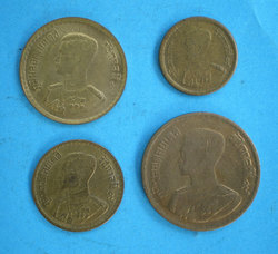 เหรียญบรอนซ์ทอง ชนิดราคา ๕๐ สต. ๒๕ สต. ๑๐ สต. และ ๕ สต. รัชกาลที่ ๙ ด้านหลังตราแผ่นดิน พ.ศ. ๒๕๐๐ สภาพสวยมาก ผิวเดิม หายาก ราคา ชุดละ 100 บาท (w.739)