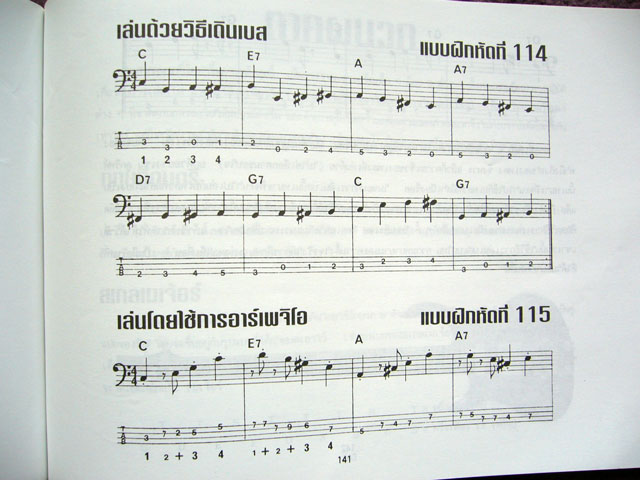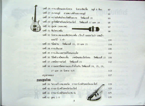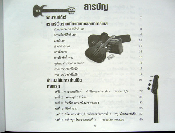 กีต้าร์เบสไฟฟ้าถือกำเนิดขึ้นมาบนโลกภายหลังจากการเกิดกีต้าร์ไฟฟ้า 6 สาย คือเมื่อประมาณ 40 ปีมาแล้วนี่เองนับว่าเป็นเครื่องดนตรีชิ้นเดียวในบรรดาเครื่องดนตรีทั้งหลายในวงร็อคและวงป๊อปที่มีประวัติความเป็นมาสั้นที่สุด เนื้อหาภายในหนังสือเล่มนี้เริ่มด้วยเรื่องพื้นฐานเบื้องต้นได้แก่...ส่วนประกอบของกีต้าร์เบส การเลือกกีต้าร์เบส แอมป์เบส สายกีต้าร์เบส การตั้งสาย, วิธีการเล่นเบส เล่นโดยใช้พิ๊คดีด เล่นโดยใช้นิ้วดีด, คำแนะนำในการอ่านโน้ตและแท๊พบเลเจอร์ ตารางคอกีต้าร์ แบบฝึกหัดแรก เพลงบลูส์ 12 ห้อง, เสียงโน้ตบนสายต่างๆ ตำแหน่งต่างๆ, บันไดเสียงเมเจอร์, จังหวะ 3/4, เสียงชาร์พและแฟลท, โน้ตตัวเขบ็ตหนึ่งชั้น, ลูกริฟฟ์, ตัวโน้ตบนคอกีต้าร์, สเกลเมเจอร์คีย์ต่างๆ , ริฟฟ์แบบต่างๆ พร้อมแบบฝึก, การดีดสลับ, บลูส์แพทเทิร์นแบบต่างๆ, เทินอราวด์แพทเทิร์น, โน้ตตัวดำประจุด, สแต็คคาโต้, การโยงเสียง, ตัวหยุดเขบ็ตหนึ่งชั้น, จังหวะสามพยางค์, ลูกริฟฟ์สามพยางค์, การเปลี่ยนแปลงจังหวะ, จังหวะซัฟเฟิล, บลูส์ 8 ห้อง, สเกลบลูส์, สามพยางค์ด้วยสเกลบลูส์, ตำแหน่งของสเกลบลูส์ตลอดคอกีต้าร์, ความสัมพันธ์ของริฟฟ์กับสเกล, บลูส์ริฟฟ์สามพยางค์, ลูกริฟฟ์สำหรับคอร์ดไมเนอร์, ลูกริฟฟ์จากสเกลเพียวไมเนอร์, ลูกริฟฟ์จากสเกลฮาร์โมนิคไมเนอร์, ลูกริฟฟ์จากสเกลบลูส์, คู่แปด(ออคเทฟ), ซินโครเพชั่นพร้อมแบบฝึก, เร็กเก้, บอสสะโนว่า, แซมบ้า, แมมโบ้, ช่า-ช่า-ช่าพร้อมแบบฝึก, โน้ตผ่าน, โน้ตเอ็นฮาร์โมนิค, การเดินเบส, โน้ตตัวเขบ็ตสองชั้น, เทคนิคแฮมเมอร์ออน(เคาะสาย), เทคนิคการสไลด์(รูดสาย), การผสมโน้ตหลายแบบเข้าด้วยกัน, การสร้างแนวเบส, โครงสร้างของคอร์ดและการเล่นอาร์เพจิโอโดยใช้โน้ตในคอร์ด, การเปรียบเทียบสไตล์การเล่น, ตารางสูตรของคอร์ด, การรวมวง, การแกะเพลง ฯลฯ ...เฉพาะหนังสือเล่มละ 79 บาท หนังสือพร้อมซีดีเสียงชุดละ 139 บาท