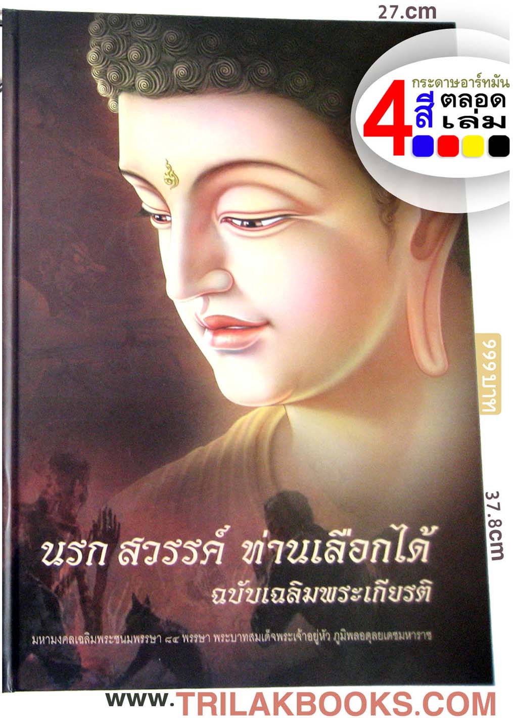 หนังสือเรื่อง นรกสวรรค์ท่านเลือกได้ ฉบับเฉลิมพระเกียรติ เรียบเรียงโดย คุณไขแสง กิตติวัชระชัย ปกแข็ง เย็บกี่ อาบ PVC ด้าน ขนาด 27*37.8 CM กระดาษ อาร์ทมัน อย่างดี จำนวน 368 หน้า 4สีตลอดทั้งเล่ม