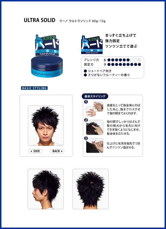 +++Ultra Solid : สำหรับ ผมสั้นมาก-ยาวปานกลาง ทำให้เซ็ตผมตั้งได้อย่างเป็นธรรมชาติ เนื้อแว๊กซ์จะด้านๆ ไม่เงา อยู่ทรงตลอดทั้งวัน ไม่หนักหัว ล้างออกง่ายและไม่เหนียวเหนอะหนะ เป็นรุ่นที่ขายดีที่สุดในญี่ปุ่น**เหลือ1กระปุก