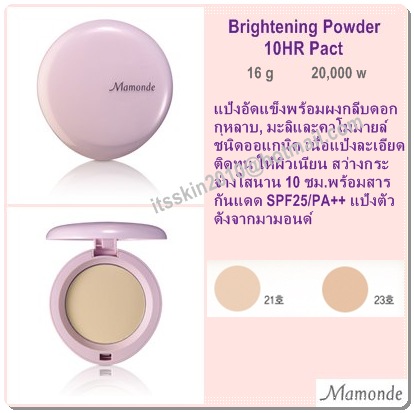 Mamonde Brightening Powder Pact 10 hrs แป้งดังของมามอนด์ เครื่องสำอางแบรนด์พรีเมี่ยมจากเกาหลี เนื้อแป้งละเอียด ติดทนนาน ให้ผิวสว่าง กระจ่างใสแบบมีมิติ สไตล์สาวเกาหลี สวยนานตลอดวัน ไม่ต้องเติมบ่อย พร้อมผง shimmer ประกายแวววาว และส่วนผสมของผงกลีบดอกไม้ (กุหลาบ,มะลิ และดอกคาโมมายล์) และสารกันแดด SPF25/PA++