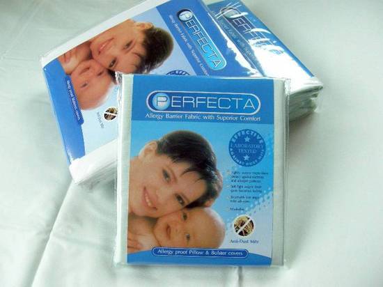 ผ้ากันไรฝุ่น PERFECTA ผลิต ผ้าปูที่นอน ปลอกหมอน ปลอกหมอนข้าง ป้องกันไรฝุ่นที่ผลิตจากเส้นใยไมโครไฟเบอร์ เกรด A ที่มีเส้นใยที่เล็กและละเอียดทอสานแน่นกว่าผ้าปูที่นอนปกติทั่วไป จนทำให้ไรฝุ่นและสารก่อภูมิแพ้จากไรฝุ่น ในที่นอน หมอนและหมอนข้าง ไม่สามารถผ่านขึ้นมาสัมผัสร่างกายเราได้ ซึ่งจากการรายงานผลการวิเคราะห์ผลิตภัณฑ์ PERFECTA ได้ผ่านกระบวนการทดสอบแล้วว่าสามารถป้องกันไรฝุ่นและสารก่อภูมิแพ้ไรฝุ่น ได้ถึง 99.9% จาก