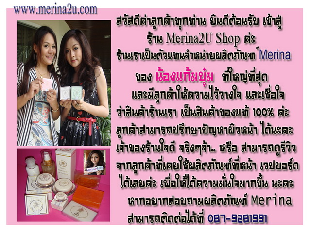 สำหรับลุกค้าที่เข้ามาอ่าน แล้วสนใจ สามารถ เข้าชมร้านค้า ได้ที่ www.merina2u.com ค่ะ มีสินค้าให้เลือกมากมาย รวมทั้ง รีวิว ของลูกค้า ทั้งก่อนใช้ และหลังใช้ แล้วได้ผล เป็นอย่างไร เพื่อเพิ่มความน่าเชื่อถือ สามารถ ติดตามกันได้ รวมไปถึง กิจกรรม ของแจก ของแถมมากมายเลยค่ะ แล้วพบกันค่ะ