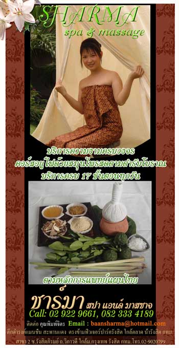 | ติดต่อ: | คุณพิมพ์จิตร( Sharma Spa & Massage) | อีเมล์: | |||