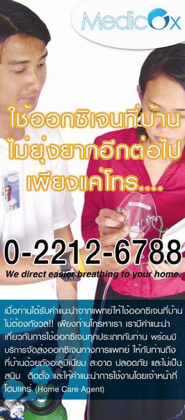 เมดิคอกซ์ ผู้ให้บริการจัดส่งออกซิเจน(อ็อกซิเจน)การแพทย์แก่ผู้ป่วยที่บ้าน ผ่านสายตรง Medicox Oxygen Line : 0-2212-6788 โดยสายตรงดังกล่าว จะให้บริการให้คำปรึกษาวางแผน การใช้ออกซิเจนที่บ้านตามคำสั่งแพทย์ และแนะนำการจัดหาชุดอุปกรณ์การให้ออกซิเจนที่เหมาะสม รวมถึงการจัดเติมออกซิเจนการแพทย์ (Refill) ซึ่งปัจจุบัน เมดิคอกซ์ ได้รับความไว้วางใจจากกลุ่มผู้ป่วยเข้ามาใช้บริการ กว่า 130 รายด้วยกัน รวมถึงเป็นศูนย์ดูแลด้านการให้บริการออกซิเจนการแพทย์ แก่กลุ่มผู้ป่วยที่ต้องกลับไปใช้ออกซิเจน(อ็อกซิเจน)ที่บ้านจากหลายสถานพยาบาลด้วยกัน อาทิเช่น โรงพยาบาลจุฬาลงกรณ์ โรงพยาบาลบำรุงราษฎร์ โรงพยาบาลกรุงเทพคริสเตียน โรงพยาบาลธนบุรี โรงพยาบาลวิชัยยุทธ และ ศูนย์ฟอกไตชีวเวช เป็นต้น