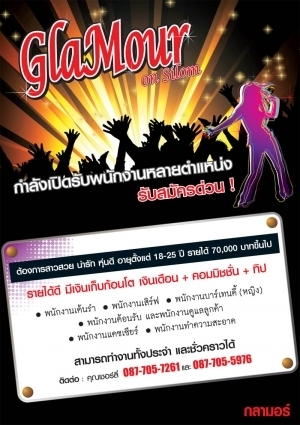 ต้องการพนักงานหลายตำแหน่ง Glamour Entertainmentbar ต้องการสาวสวย น่ารัก หุ่นดี อายุ 18-25 ปี มีรายได้ต่อเดือน 70,000 ขึ้นไป