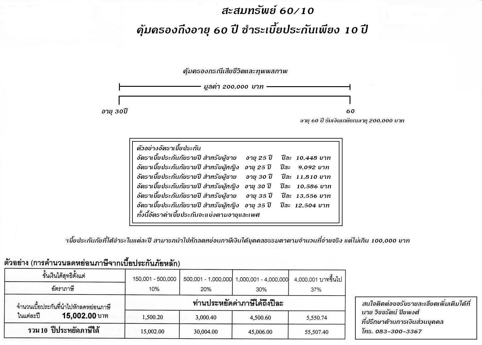 ตัวอย่างแบบประกันที่แนบมาให้เป็นแบบ 60/10 คุ้มครองถึงอายุ 60 แต่ชำระเบี้ยเพียง 10 ปี