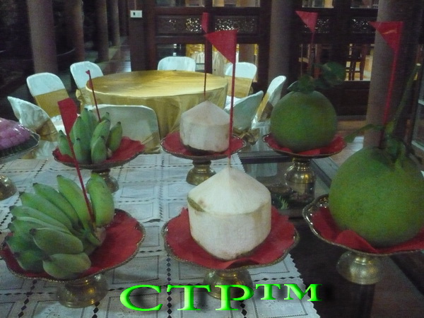 ๓. ผลไม้แห่ขันหมาก ๓ คู่ ส้มโอ กล้วย มะพร้าวอ่อน รวม ๖ พาน
