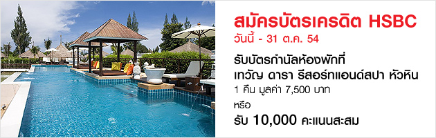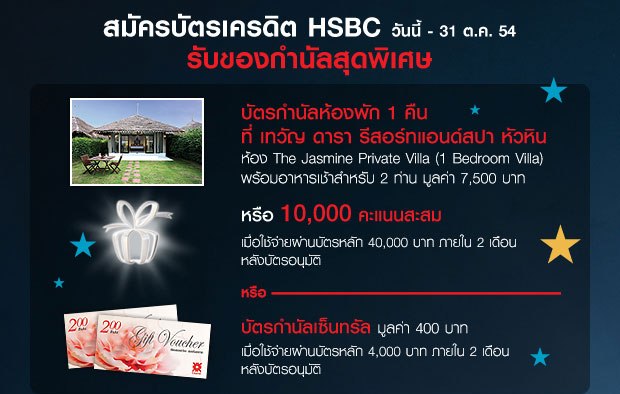 สมัครบัตรเครดิตHSBCรับบัตรกำนัลเซ็นทรัล/โลตัส 400 บาทหรือ บัตรกำนัลห้องพักที่ เทวัญ ดารา รีสอร์ทแอนด์สปา หัวหิน 7,500บาท หรือ รับ 10,000 คะแนนสะสม วันนี้ - 31 ต.ค. 54