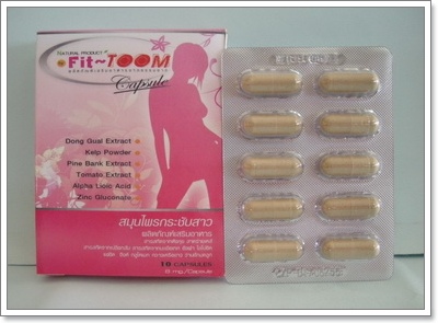 วิตามินซีผิวขาว Fit-Toom ฟิตตูม สมุนไพรกระชับสาว อกฟูรูฟิต เป็นผลิตภัณฑ์เสริมอาหาร วิตามินซีผิวขาวfit&toom ผลิตจากสมุนไพรธรรมชาติ ซึ่งล้วนแต่ทรงคุณค่าสำหรับสตรี เช่นตังกุย มีสรรพคุณช่วยให้ประจำเดือนมาสม่ำเสมอแก้ปวดประจำเดือน บรรเทาอาการปวดหัว ปวดเมื่อยตามตัว ทำให้มดลูกบีบตัวอย่างธรรมชาติและคลายตัวตามปกติ สาหร่ายเคล์ ทำให้ต่อมไทรอยด์ทำงานได้ปกติ ปรับสมดุลฮอร์โมนเพศและช่วยให้ประจำเดือนมาปกติ ลดอาการปวดข้อ บรรเทาอาการไขข้ออักเสบ ช่วยให้อวัยวะภายใน ตับไต ทำงานดีขึ้น ลดการเกิดโรคมะเร็งทรวงอก โรคมะเร็งปากมดลูกกวาวเครือขาว ออกฤทธิ์ คล้ายฮอร์โมนเอสโตรเจน และออกฤทธิ์ต้านอนุมูลอิสระ วิตามินซีผิวขาวให้ร่างกายแข็งแรง สดชื่น ลดการหลุดร่วงของเส้นผม กระฝ้าดูจางลง กระดูกทั้งร่างกายแข็งแรง กระตุ้นให้ต่อมน้ำนมเจริญขึ้น มีผลทำให้หน้าอกใหญ่ขึ้น และยังกระชับหน้าอก ส่วนที่หย่อนคล้อย หย่อนยาน ช่วยกระชับหน้าท้อง ต้นแขน ต้นขาได้อีกด้วย สารสกัดจากเปลือกส้ม ซึ่งอุดมไปด้วยวิตามินซีช่วยให้ผิวขาว และสาร Citrus Bioflavonoid ซึ่งเป็นสารต่อต้านอนุมูลอิสระช่วยให้ผิวขาว ป้องกันการแก่ก่อนวัย ให้ระบบการไหลเวียนของโลหิตดีขึ้น ให้ผิวพรรณเปล่งปลั่ง ผิวขาว ดูสุขภาพดีมีชีวิตชีวา