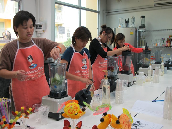 - สอนการทำไซรัป น้ำเชื่ม (Syrup) น้ำเชื่อม แบบเข้มข้น และแบบใส วิธีการเก็บรักษา ไซรัปน้ำเชื่อมของเราให้ใช้ได้นานเป็นปี โดยรสชาติไม่เปลี่ยน รับรองไม่มีสารกันบูด - สอนการทำ ไซรัปน้ำมะนาวหวาน (lemon Syrup) สำหรับเป็นส่วนผสมของเครื่องดื่มเกือบทุกชนิด สอนเทคนิคและวิธีการ คั้นมะนาวไม่ให้ มีกลิ่นและรสชาติที่ขม และยังสามารถเก็บไว้ใช้ได้นาน โดยยังคงรสชาติ ความเปรี้ยวหวาน หอมกลิ่นมะนาวเช่นเดิม และเทคนิคการเก็บรักษา และเตรียม ไซรัปมะนาวหวานในช่วงที่มะนาวแพง - สอนการทำ ครีมมี่ (Creammy) สำหรับใช้เป็นส่วนผสมในการทำเครื่องดื่มปั่นสไตล์มิล์คเชค ไอศครีมปั่น ฯลฯ ช่วยทำให้ประหยัดต้นทุน แต่รสชาติหวาน หอม มันกลมกล่อมมากกว่าเดิม พิเศษ up date ล่าสุดโดนใจเด็กๆ วัยรุ่น ผู้ใหญ่ >> milk Creammy สูตรครีมมี่รสนม, vanila Creammy สูตรครีมมี่วลิลา รสชาดหอมหวานมันกลมกล่อม ไม่ซ้ำใคร พร้อมการทำ วิปปิ้งครีม (wipping cream) และเทคนิควิธีการเก็บรักษาให้ใช้ได้นาน - สอนทำน้ำผลไม้ปั่น แบบผลไม้อย่างเดียว หรือผลไม้แบบผสม สองถึงสาม อย่างขึ้นไป ในสไตล์ สูตร ฟรุ้ตตี้ (Fruite) สูตร เชอร์เบท (Sorbets) เช่น lemon fruite, lemon mint, Orangre fruite,stawberry sorbets, passion sorbets, mixberry sorbets, Lychee sorbets และสูตรต่างๆ อีกกว่า 30 ชนิด - สอนทำน้ำผลไม้ปั่น นมสด มิ้วล์คกี้ (milkky) และผลไม้ปั่นครีมมี่ (creammy) เช่น Cantaloupe milkky, Coconat milkky,Banana creammy, Oreo creammy, Cookie & Creammy และสูตรต่างๆ อีกกว่า 30 ชนิด - สอนทำสมูทตี้เพื่อสุขภาพ (Smoothies for Healthy) และสมูทตี้แฟนซี (smoothies fancy) เช่น - สูตร Sliming (รูปร่างดี) , สูตรDetox (ล้างสารพิษ), สูตร ueauty skin (ผิวสวย), สูตร Fresh up (สดชื่น), สูตร Pregnant love (บำรุงครรภ์), สูตรAnti-cancer (ป้องกันมะเร็ง), สูตร Eye brighter (ดวงตาสดใส) - Water apple, redsweet, Redberry, StrawberryDiva, Divatango และสูตรสมูทตี้อีกมากมายกว่า 30 ชนิด - สอนทำ เครื่องดื่มปั่น สไตล์ เฟรปเป้ Frappe' mlikshake,โยเกิร์ตปั่น Yogurt ,กาแฟปั่น coffee Frappe',ชาเขียวปั่น greentea Frappe'และสูตรต่างๆ อีกกว่า 20 ชนิด - สอนวิธีการ ตกแต่งสมูทตี้แฟนซี การ beverage ตกแต่งเครื่องดื่มแต่ละแก้วให้ ดูดี มีสไตล์ ทันสมัย หรูหรา สวยงาม หลากหลายไปด้วย ทอปปิ้งผลไม้ต่างๆ ไม้ซ้ำแบบใคร สำหรับดึงดูดลูกค้าเพื่อการตลาด ทำให้เพิ่มมูลค่าได้อีก และประหยัดต้นทุน ไม่เหมือนใครที่นี่ที่เดียว ที่ Lekcooking