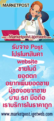 ถ้าท่านไม่มีเวลามากพอ เรารับโฆษณาสินค้า โฆษณาบริการ โฆษณาเว็บไซต์ ลงในกลุ่มเป้าหมายของท่าน ตลาดซื้อ-ขายออนไลน์ ยอดนิยม เช่น Pantip Sanook Yellopages WeloveShopping Thaisecondhand และบอร์ดยอดนิยมอื่นๆ ค่าบริการเพียงเดือนละ 350-500 บาท คุณมีหน้าที่รับ order อย่างเดียว ปล่อยให้งานขายเป็นงานของเรา คุณไม่จำเป็นต้องมีหน้าร้าน Online แค่คุณมีสินค้า เราลงโฆษณาตรงกลุ่มเป้าหมาย รอรับ Order ได้เลย หรือ หากคุณมีเว็บไซต์ ลูกค้าสามารถค้นหาเว็บ หรือบริการของคุณได้พบ จาก Serch Engine google yahoo MSN ด้วยการโปรโมทอย่างต่อเนื่อง รับประกัน ว่าราคานี้คุ้มสุดคุ้ม และพิเศษสุดๆ โปรโมทกับเราวันนี้ ลงให้ฟรี 1 ครั้ง ที่ - http://marketpost.igetweb.com